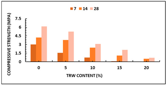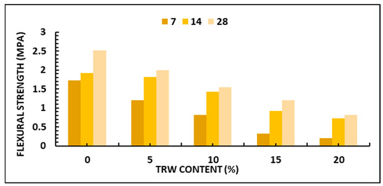 It can be observed from Figure 4 and Figure 5 that, with an increase in TRW content, there was a reduction in both CS and FS. Furthermore, it can be observed that with increasing hydration duration from 7 to 28 days, there was an increase in both CS and FS. Additionally, the bricks produced with up to 10% TRW replacement passed the FS requirements for concrete bricks, which range between 1.4 and 3.4 MPa [69]. As required by standards, the bricks that contained 10 and 5% TRW met the non-load- and load-bearing requirements for masonry units, respectively, [49]. It can be concluded that the bricks produced with up to 10% TRW passed the CS and FS requirements for units that can be used in small buildings.