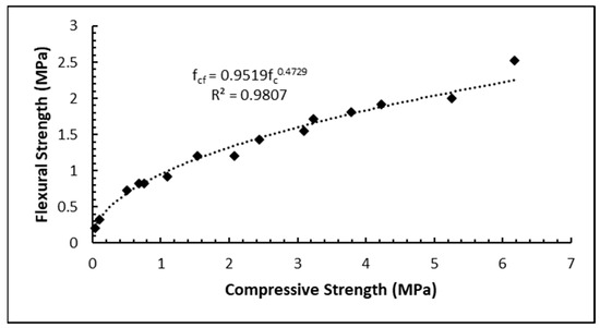 A theoretical model that can be used to correlate the CS and FS of the green bricks was developed. The exponential, linear, power, and logarithmic models were produced, and the model that gave correlation coefficients (R) of almost 1 was selected as the most acceptable relationship. Hence, the power model was selected as the most acceptable relationship, which is consistent with the work carried out by Oke and Abuel-Naga [14], as shown in Table 4. Figure 6 shows the relationship between the CS and the FS of the bricks.