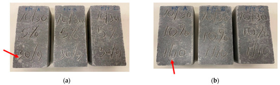 It can be observed that the samples that were prepared without TRW (Figure 7a,b) had no physical changes before and after the 10 cycles, but the samples that had 5 and 10% TRW had some abraded spots on the surface of the bricks, as shown in Figure 8a,b. This shows that the samples that had no TRW content exhibited better F-T durability and were classed as frost-resistant bricks. The samples that contained 5 and 10% TRW were classified as non-frost-resistant bricks. In practical applications, frost-resistant bricks are termed frost-durable bricks [62,63].