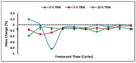 The mass change in the brick samples was also monitored during the F-T cycles. After each cycle, the bricks were weighed, and average values were taken. Figure 9 shows the plots of the F-T cycles against the mass change.