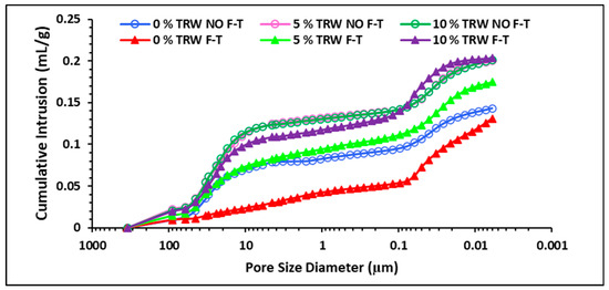 - The results of the MIP tests carried out on the brick samples containing 0, 5, and 10% TRW showed that two distinct pore sizes were present in the bricks. The bricks that had 0% TRW fell under the durable region, which was confirmed by their surface appearance after the F-T cycles. Furthermore, a peak intrusion volume of 0.095 mL/g was recorded for the 0% TRW (F-T), after which the curve flattened. This translates to durability, irrespective of the effect of the F-T cycles. The brick samples containing 5 and 10% TRW fell within the uncertain and non-durable regions, respectively, which can be attributed to the presence of the TRW in the bricks.