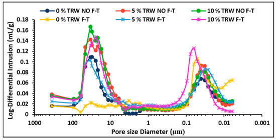 Research by Koroth, [52], Mensinga, [53], Elert et al. [65], and Stryszewska and Kanka [66] has shown precisely that the large pores within the samples are responsible for the good resistance of clay bricks to F-T cycles. Furthermore, pores larger than 3 µm in diameter have a beneficial effect on the frost resistance of bricks [55,62]. This section examines the influence of raw materials’ (LKD-GGBFS blend and TRW) characteristics on the porosity, pore volume, and pore size distribution, which were used to assess the LKD-TRW bricks.