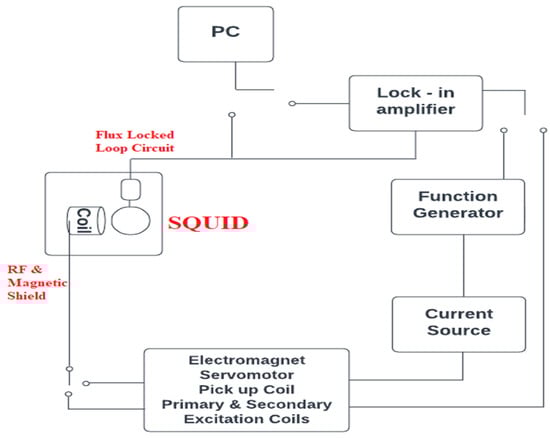 In [117], magnetic characterization of glycerin and serum solvents was done using high-temperature SQUID magnetometers. The analysis is based on both AC and DC magnetometers: a hybrid magnetometer [58], with a vibrating and rotating sample, depicted in Figure 4, and an AC magnetometer for immunoassay.