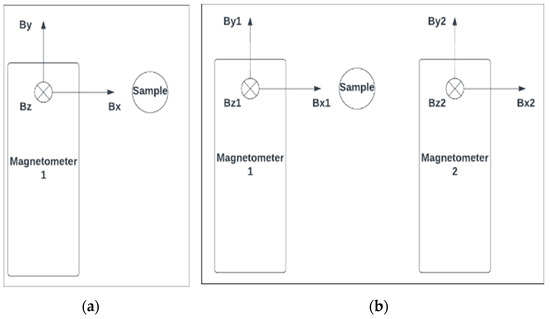 Schematic diagram of the two different fluxgate setups: (a) single fluxgate arrangement, (b) differential fluxgate arrangement [42].