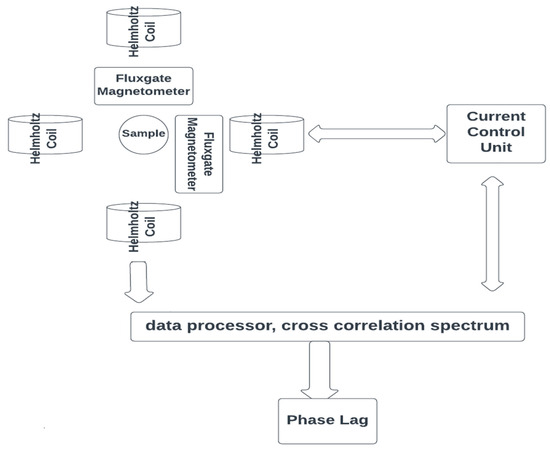 The most important studies that use the fluxgate magnetometer are summarized below. More specifically, in [19], two fluxgate magnetometers, in a gradiometer arrangement, have been used, for Fe3O4-based nanoparticle sample characterization, while the magnetization of samples is provided using Helmholtz coils. In [8] Fe3O4 nanoparticles are also characterized using fluxgate magnetorelaxometry, and the findings are compared with those provided by AC susceptibility, photon correlation, and transmission electron microscopy methods. In [26], a fluxgate magnetometer set up for cobalt-based nanoparticle characterization is proposed. The method is proven ideal for materials with high magnetic moment, while both the bed of the catalyst and peripherals, for temperature sensing or probes that monitor the reaction, can be successfully included in the measurement system. In [27], the behavior of magnetic nanoparticles in a rotating magnetic field is studied, using a setup based on fluxgate magnetometers. The configuration of the system is depicted in Figure 6. The investigation aims to detect the phase lag between the magnetization of the sample and the rotating magnetic field. This is also the novelty of the article, as the majority of the existing works on this topic focus on the magneto-mechanical coupling and not on the phase lag.