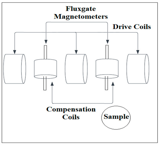 In [127], a measurement setup consisting of three applied field coils and two fluxgate magnetometers for the detection of nanoparticle properties in an economical way is proposed. The schematic diagram of the aforementioned setup is depicted in Figure 8, where both the compensation and drive coils are visible, as well as the fluxgate sensors, which are used for nanoparticle characterization.