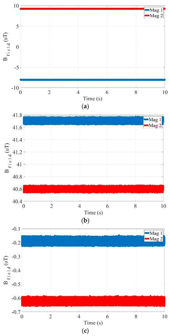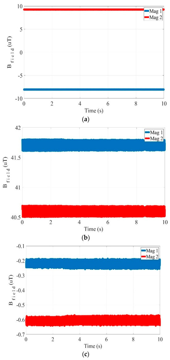 The magnetic field values, when the sample is absent, are derived from the two magnetometers in (a) x axis, (b) y axis, and (c) z axis.