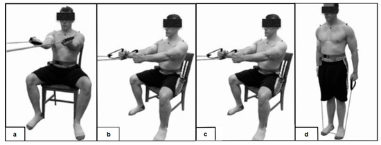 For the fourth movement (Shoulder Extensions), participants were instructed to stand. A bungee cord was used to provide resistance during the movements. The cord was positioned at a distance that offered sufficient challenge without being overly difficult. Participants grasped the ends of the bungee cord with their hands.