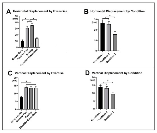 There was a significant main effect of exercise type on vertical displacement. Biceps Curls exhibited significantly less vertical displacement compared to Reverse Flys, Rowing, and Shoulder Extensions. This is attributed to the nature of the Biceps Curls movement, which primarily involves altering the angle of the elbow joint while stabilizing the shoulder and shoulder blade. In contrast, Reverse Flys, Rowing, and Shoulder Extensions entail lateral rotation of the humeral head while maintaining stability in the shoulder and shoulder blade, resulting in potentially greater vertical displacement. Rowing additionally involves both humeral head movement and elbow joint angle adjustment, as the arms move backward from a forward position. Shoulder Extensions engage the upper trapezius and deltoid muscles, potentially causing vertical movement in the shoulder and shoulder blade [