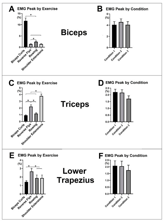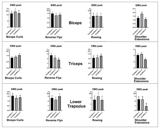 However, significant differences in %EMG peaks between exercises were noted: biceps brachii for Biceps Curls, lower trapezius for Reverse Flys, and triceps brachii for Shoulder Extensions. These findings align with the expected muscle activation patterns for these exercises. For instance, Biceps Curls target the biceps brachii, along with other anterior upper humeral muscles, resulting in higher %EMG peaks. The stable upper attachment sites at the scapula during this movement lead to forearm movement toward the shoulder joint, with the triceps brachii and lower trapezius contracting to stabilize the humerus and scapula [