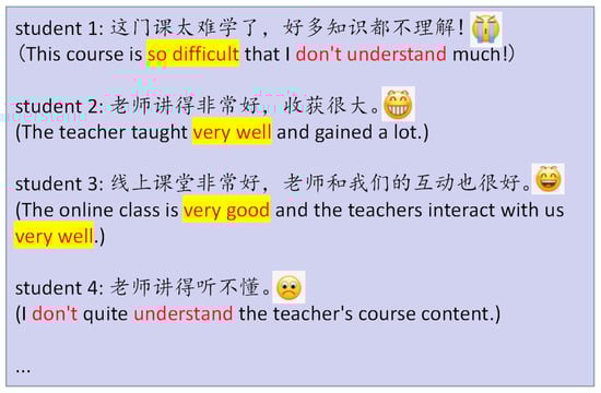 Online education is a new form of education with a significant impact on the current mode of communication in higher education. Compared with traditional offline education, online education has distinct characteristics and advantages [1,2]. For example, online education platforms, through the use of new technologies, are more convenient for spreading high-quality educational resources and promoting the principle of educational fairness [3]. Through online education, students can fully express their personality and increase their sense of achievement, which also promotes students’ interest in learning and motivation for continuous learning. However, with the current explosive growth of online education, the educational resources of various platforms are uneven [4] and the platforms are not interconnected, which leads to inconsistent student participation and to some students’ online education being ineffective [5]. An analysis of data on the current state of students’ online education can also reflect their learning situation, especially by looking at students’ comments on different courses [6] which directly reflect the students’ attitudes toward their current courses [7]. If this part of the data can be fully exploited, it can be successfully fed back to course instructors, improve the utilization of online education resources [8], and improve the effects of online education on students.