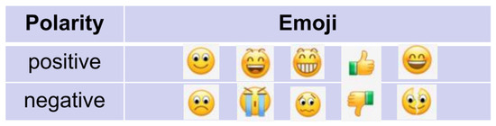 We selected two groups of emoji data with strong emotional polarities, as shown in Figure 3. When the emoji data were included in the comment data, we first separated the text and emoji data. For the separated emoji data, we directly identified the emoji’s emotional polarity through the emoji recognition module. In this process, we used a simple emoji-matching method, because each emoji expression corresponds to an emotional polarity; when the emoji expression was effectively recognized, its corresponding emotional polarity value was directly obtained.
