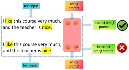 In this paper, we automatically added a positive and negative emoji to a piece of text. By means of joint training and ultimately outputting the emotional polarity, we evaluated and judged whether the added emojis were correct. Relying on network training, we ultimately obtained emojis with higher matching degrees and enhanced the model’s accuracy in multi-modal emotion recognition. The structure contains three parts: text input, emoji prompt and polarity prediction, and emoji judgment. The structural diagram of this process is shown in Figure 4.