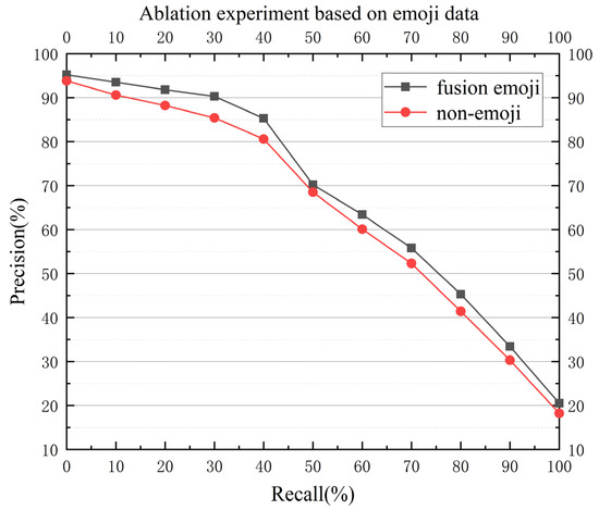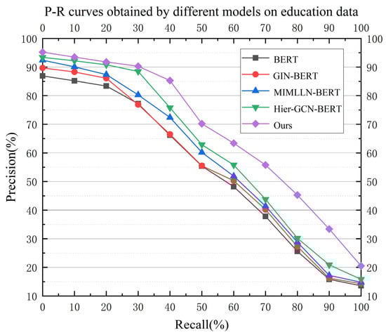 Several models based on BERT were selected for comparison: BERT [40], GIN-BERT [38], MIMLLN-BERT [39], and Hier-GCN-BERT [42]. The P-R curves are shown in Figure 5 and Figure 6. Figure 5 shows the performance of different models on the education data, on which our model performs best, and Figure 6 shows the ablation experiment; after using the emoji expression data as the prompt, the performance of the model improved to a certain extent, which also shows that our model is effective in introducing emoji data.