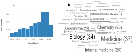 Number of publications on metabolomics, proteomics, lipidomics and meat quality/safety between 2014 and 2024 grouped by (A) year of publication and (B) publication subject (data were obtained from www.lens.org (accessed on 6 June 2024)).