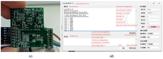 The SPI protocol used in this paper represents the third method for connecting devices, leveraging the combined capabilities of ARM and FPGA in the ZYNQ device. This third protocol is an FPGA-level simulation of the SPI protocol, configuring the FPGA’s GPIO pins to function as needed for the SPI bus, such as SCLK, MISO, MOSI, and CS. It also uses the FPGA’s internal clock module to generate the SCLK clock signal, connecting to the ADS7042 and other sensors that utilize the SPI communication protocol. This program simulated SPI device communication by creating a PCB board, as shown in Figure 5, which includes the PCB layout, schematic, and actual board image. This is intended to demonstrate its scalability. The board incorporates two ADS7042 converters and two OPA835 operational amplifiers, and also integrates a LoRa module for complete communication integration. The image below shows normal reception of sensor-transmitted data at default 0 voltage. The bottom left corner features the circuitry for the LoRa module, the top left corner shows the ADS7042 and OPA835 devices, and the right side displays the interface circuits connecting to ZYNQ. Figure 5d shows the window of the Serial Port Assistant. Please refer to the translated English notes for the relevant settings.
