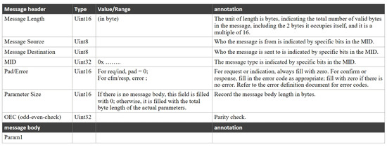 After receiving the data, it is necessary to add a header to define the received data. Since there is no universal protocol for this part, a custom protocol is required to facilitate bidirectional communication of data. The protocol utilized in this program consists of seven parts: a 2-byte message total length, a 1-byte message source, a 1-byte message destination, a 4-byte message ID, a 2-byte flag indicating normal or error message, a 2-byte length of the message body, and a 4-byte parity check, totaling 16 bytes. This structure allows for indicating the source and destination of the message, combined with the checksum and message length to effectively prevent message loss during transmission, thereby meeting the requirements of different application scenarios. Additionally, there is a maximum data quantity limit for the message body, serving as an effective buffer for data transmission to prevent interruptions due to insufficient bandwidth.