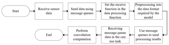The data received from the sensors are processed on the PS side of ZYNQ. Data processing is conducted using C language within the “static void data processing(void *pvParameters)” task of the FreeRTOS operating system. When data are received from other sensors, such as MPU6050, after a certain amount of data accumulation, the FreeRTOS message queue’s sending function is utilized. Simultaneously, within the data processing function, the message queue’s data receiving functionality is set up. Upon receiving the data, the data undergo processing, and subsequently, using the message queue functionality, the processed data are sent to the “static void cnn_use(void *pvParameters)” task for convolutional calculations; refer to the flow chart in Figure 9.