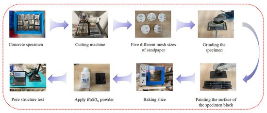 The American Society for Testing and Materials (ASTM C457-2016 [41]) straight-line conductor method was used to conduct the pore structure test utilizing the Model TR-AHS Hardened Concrete Pore Structure Tester. The procedure for preparing a pore structure specimen was as follows: Firstly, a cutting machine was used to cut 100 mm × 100 mm × 10 mm slices; secondly, the slices were roughly ground, finely ground, roughly polished, and finely polished with five different mesh sizes of sandpaper, and the test pieces were cleaned and dried after the above steps were completed; then, the polished surfaces of the specimens were blackened with a black water-based marker and put in a drying box at 105 °C for 30 min. Then, the pores were filled with barium sulfate powder to melt into the pores, the excess powder was removed, and the rest of the surface was left black. Finally, the specimen was placed on the test bench for measurement. The observed area of the specimen was 80 mm × 80 mm. The experimental procedure is shown in Figure 1.