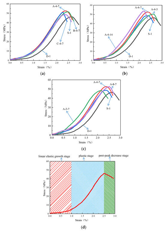 Stress–strain curves under different test conditions. (a) Stress–strain curves under different surface reinforcer types. (b) Stress–strain curves under different durations. (c) Stress–strain curves with different application numbers. (d) Three stages of concrete stress–strain curve.