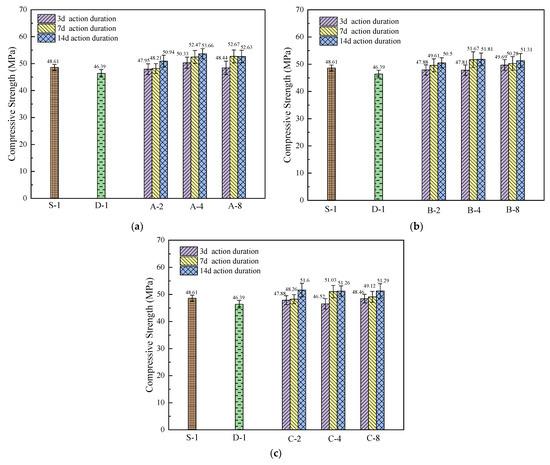 Compressive strength of concrete specimens under different conditions. (a) Compressive strength changes under different test conditions of surface reinforcer type A. (b) Compressive strength changes under different test conditions of surface reinforcer type B. (c) Compressive strength changes under different test conditions of surface reinforcer type C.