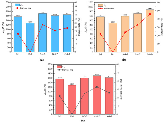 The deformation modulus E50 was an important indicator for evaluating the deformation properties of concrete materials. In this study, the ratio of 50% peak stress in the stress–strain curve to its corresponding strain was selected as the deformation modulus [42]: