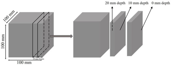 Due to the fact that NMR could only measure the pore size distribution of the repaired concrete specimens, the remediation effect of surface reinforcer under different layer depths could not reveal the effect that four applications and 7 d action duration had, and the pore structure of the specimen repaired by surface reinforcer type A was estimated by measuring the pore structure on the surface (0 mm in depth), at a depth of 10 mm and at a depth of 20 mm, respectively. Specimen cutting positions were shown in Figure 6.