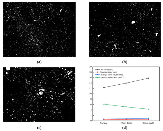 Figure 7 presented the pore morphology and pore parameters of the repaired specimens at different depths. It could be observed that air content, spacing, and average chord length on the surface of repaired specimens increased gradually, and the specific surface area decreased gradually with increased depth. Specifically, the air content was 12.3% on the surface of repaired concrete specimens, and the values were 13.95%, and 15.77% at depths of 10 mm and 20 mm, respectively, with increases of 13.4% and 28.2%, respectively. The spacing factor and average chord length of the repaired specimens at 20 mm depth were 1.33 times and 1.43 times higher than those at the surface position. Additionally, the specific surface area decreased from 6.15 mm−1 to 4.3 mm−1 when the depth increased from 0 mm to 20 mm, which reduced by a larger scale of 30%.