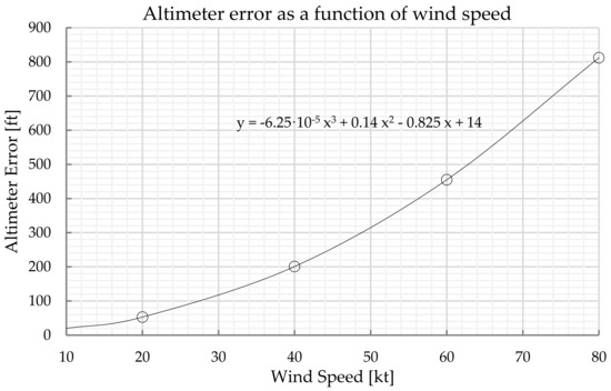 From the values in Table 1, a function can be defined to obtain the altimeter error for any wind speed in order to estimate an altimeter error clearance for each phase of flight, according to its wind speed, as proposed by the ICAO.