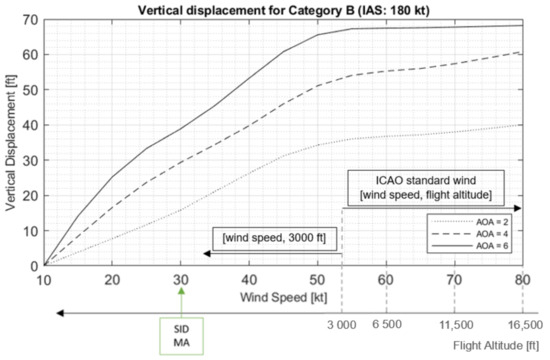 In this appendix, three tables are displayed, one for each significant angle of attack, in which the loss of altitude due to mountain wave turbulence is indicated in feet according to a wind speed for each aircraft category. This allows for a more representative comparison between the different aircraft categories operating at the same angle of attack, as well as accurate values of the vertical displacement. It should be noted that the table values were calculated from the maximum IAS specified by the ICAO for each category (Table 4), which provide the most conservative results. As shown in the tables below, categories B, C, and D have almost the same vertical displacements, following the same trend and differing by less than 2 m between correlative categories.