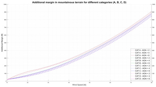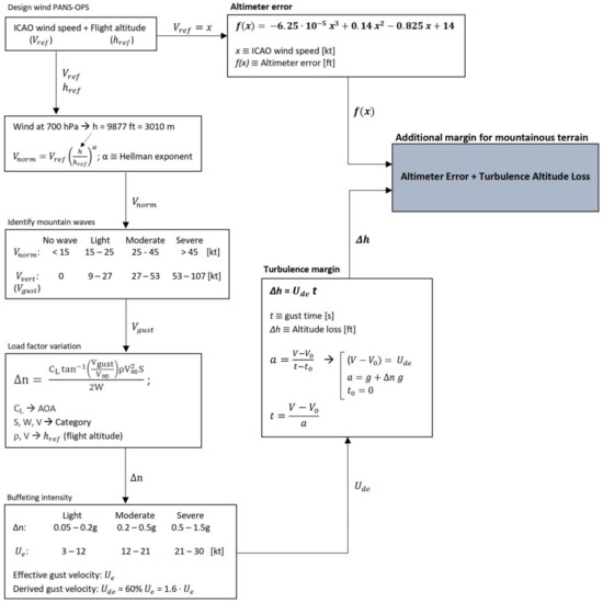 Finally, an aircraft’s loss of altitude due to turbulence was obtained as a function of the wind speed, which combined with the altimeter error determines the additional clearance in mountainous terrains that should be added according to the flight segment.