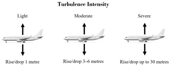 Turbulence is classified as light, moderate, severe, and extreme depending on the existing wind intensity and changes in the aircraft’s speed, in the normal acceleration variation, or in the load factor. Nevertheless, throughout this study, atmospheric turbulence classified as extreme turbulence is omitted, as aircraft operations over this type of turbulence are not possible for safety reasons and the fact that these turbulences occur in extreme cases, such as severe thunderstorms or cumulonimbus formation.