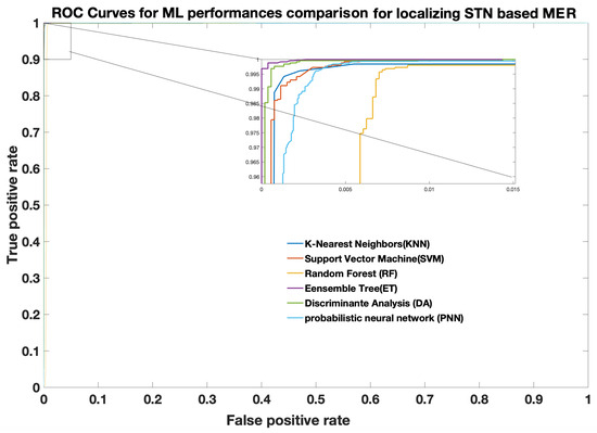 - Support Vector Machine (SVM). As already stated, the SVM classifier has shown a good achievement for the STN location based on MERs or LFP data within various scenarios. In this work, the configuration model was chosen to avoid the risk of overfitting. Accordingly, a Radial Basis Function (RBF) kernel function was used, with the kernel scale set to 1 and constraint penalty set to 1.