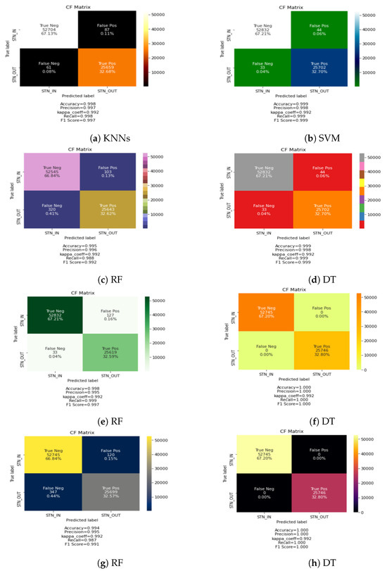 - Decision Tree (DT). In the decision tree classifier, the decision rule is made up of the features outcome learned by three compromised principal nodes: root node, decision node, and leaf node, which handle the extracted features, the branches’ decision outcome, and the predicted class (STN IN and STN OUT), respectively.