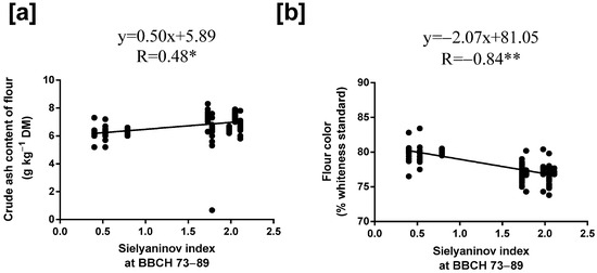 Linear regression between the crude ash content (a) and color of flour (b) vs. the Selyaninov hydrothermal index during winter wheat grain ripening. * significant at p ≤ 0.05; ** significant p ≤ 0.01.