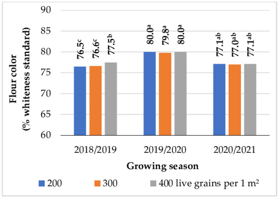 The effect of the sowing density on the color of wheat flour. Means with the same letters do not differ significantly at p ≤ 0.05 in Tukey’s test.