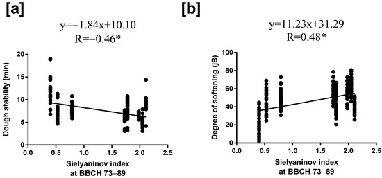 Linear regression between dough stability (a) and the degree of softening (b) vs. the Selyaninov hydrothermal index during winter wheat grain ripening. * significant at p ≤ 0.05.