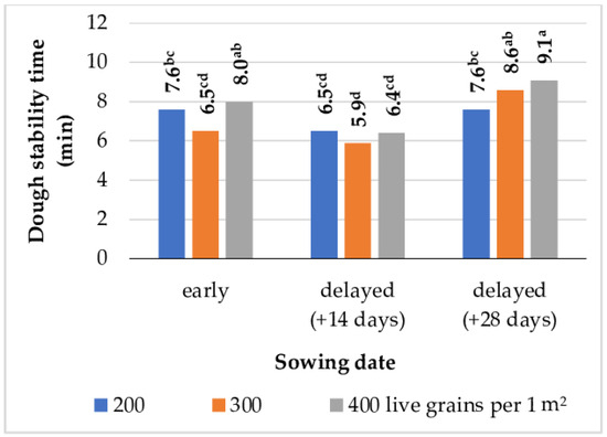 The effect of the sowing date and sowing density on dough stability. Means with the same letters do not differ significantly at p ≤ 0.05 in Tukey’s test.