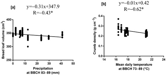 Linear regression between (a) bread loaf volume and total precipitation in the dough stage; (b) crumb density and mean daily temperature during winter wheat grain ripening. * significant at p ≤ 0.05.