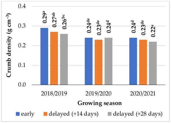 The effect of the sowing date on crumb density. Means with the same letters do not differ significantly at p ≤ 0.05 in Tukey’s test.