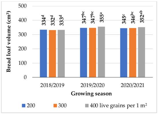 The effect of the sowing density on bread loaf volume. Means with the same letters do not differ significantly at p ≤ 0.05 in Tukey’s test.