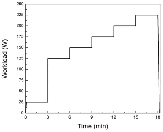 Our pilot study showed that modified physical exercise was better for provoking submaximal effort in the participants. Physiological effort was assessed by measuring the heart rate (HR). For this experiment, the level of workload was the main external parameter. Physical exercise was realized through six resistance levels (Figure 1 and Table 2). The first level was the warm-up phase (3 min with 25 W intensity). According to the HR in this level, the resistance for the next levels was defined. The cadence was 55–65 revolutions per minute (RPM) in all exercise phases. In level two, the workload was 125 W, and in each subsequent level, the participants saw an increase of 25 W. Reaching the submaximal HR (Equation (2)) determined the end of the physical exercise phase. The submaximal HR values were calculated with a percentage calculation of age-predicted maximal heart rate [23].