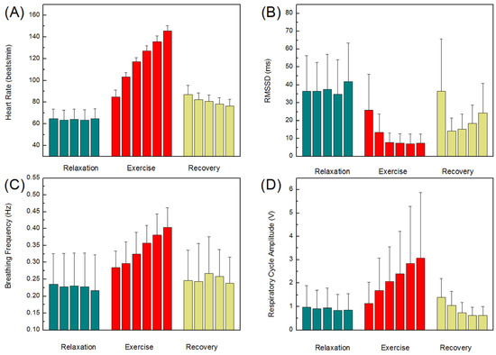 Changes in the heart rate (A), parasympathetic cardiac control, root mean square standard deviation-RMSSD (B), breathing frequency (C), and respiratory cycle amplitude (D) in three phases of the experiment. The results of statistical analysis are given in Table 3, Table 4, Table 5 and Table 6.