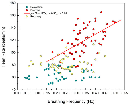 The main goal of our study was to clarify the cardio–respiratory relationship and its compensatory mechanisms in three different conditions: relaxation, exercise with submaximal HR, and post-exercise recovery in an adjusted experimental protocol in young healthy recreative male subjects. To our knowledge, this is the first study which included simultaneous measurements of the heart and respiratory signals in the previously mentioned conditions.