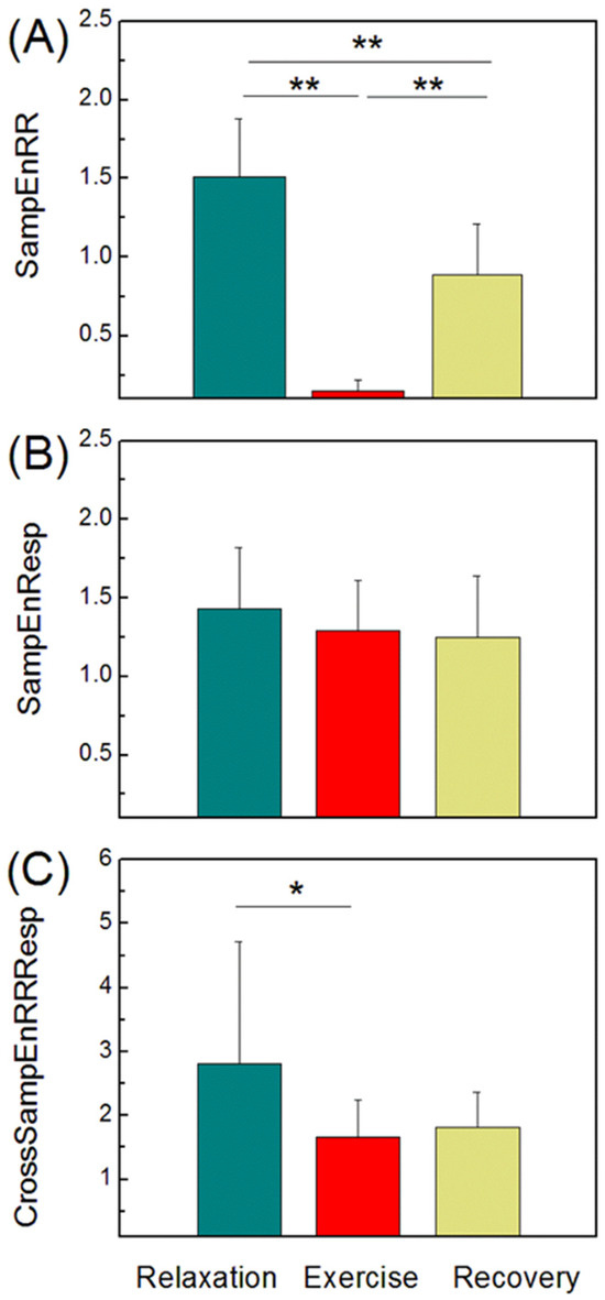 Sample entropy of the RR interval time series—SampEnRR (A), sample entropy of the respiratory signal time series—SampEnResp (B), and cross-sample entropy between the RR and respiratory signal time series—CrossSampEnRRResp (C). ** p < 0.01, * p < 0.05.