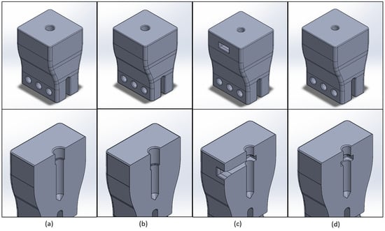 Solid models with cross-section of test samples: (a) type I.a, (b) type I.b, (c) type II, (d) type III.