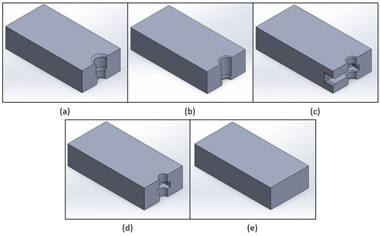 Samples are also designed for three-point flexural with each fastener implementation approach, and a blank design was added to the test for the reference. The test samples are designed according to ISO 178 standards. The width of the samples is 20 mm, and the thickness is 10 mm. The length of the samples is 80 mm, and the fasteners are placed in the middle of the part. Cross-sections of the flexural test samples are given in Figure 3.