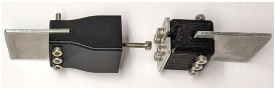 The test sample and the upper part are shown in Figure 4. A lower metal plate is attached to every test sample with three bolts. This design can be tested on any universal test bench using a vise, thanks to the metal tab on each end.