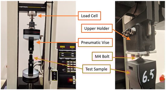 The testing device used in this study is an Instron brand 4411 model universal test bench with a 5 kN load cell capacity. The device is equipped with a pneumatic vise system for easy and quick sample change. The test setup details are presented in Figure 5.