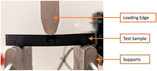 The three-point flexural test setup is presented in Figure 6. The samples of the three-point flexural test were designed according to ISO 178 standards, and the test setup was set up as recommended in the standard. The cross-section of the samples is 10 mm × 20 mm, the length is 80 mm, and the clearance between the two support points of the test bench is set to 66 mm.